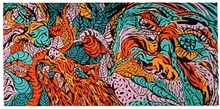 The "Meeting" series featured large-scale brush drawings, prints and paintings (up to seven-and-a-half by thirty-two feet) that intensified Himmelfarb's use of overall patterning, but developed a more dramatic narrative focus sometimes suggesting enlarged, elaborated details from the earlier drawings.[29] Most often these works, such as Lava Flow (Meeting) Red (1986) or Lumber Street Meeting (1988), depicted a pair or trio of grotesque, totemic heads (usually a man in frontal and profile views and a snarling dog), rendered in choppy interlaced brushstrokes and searing colors against black, that emerged and disappeared out of writhing vegetation.[6][15] While some critics detected the strain of "divided alter-egos" in the new work,[30] others like Art in America’s Frederick Ted Castle saw "baroque brashness," engaging "human messiness" and a rich play of dualities: representation versus non-representation, confrontation versus resolution, man versus nature/beast, the integrated personality versus its parts.[6][24][15] Andy Argy noted an intriguing play between form and image "suggesting a calligraphic version of an Abstract Expressionist gone haywire" that enabled the work to seem both serenely decorative and intensely expressionistic, and like Grimm or Andersen fairy tales, both humorous and scary.[10]