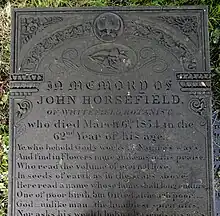 Bamford commemorated him in a poem written in 1855,[42] and Grindon wrote in 1882 that Horsefield was "one of the most celebrated of the old Lancashire operative botanists".[21] Esther died on 17 June 1872. Their son, James, and his wife, Alice, are also commemorated on the headstone.[41]