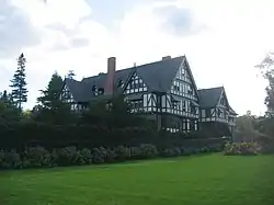 After years of renting houses in Lenox, Massachusetts,[11] they acquired a summer estate on a bluff overlooking Frenchman Bay located at 45 Hancock Street in Bar Harbor, Maine.[34] There, Kane had a Tudor Revival Cottage built between 1903 and 1904, designed by local architect Fred L. Savage, that was known both as Breakwater and Atlantique (although today it is known as the John Innes Kane Cottage).[lower-alpha 4] The interior of the house, however, featured Colonial and Georgian Revival eighteenth-century styling.[12] His widow left the home to Kane's nephew, U.S. diplomat Peter Augustus Jay and his wife, the former Susan Alexander McCook, who left it to her daughter, Susan Mary Alsop.[35]