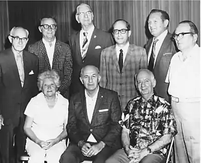 Chairman of the Board John J. Britt, seated at right at the Hollywood Stamp Club (Florida). Seated center is president Uhle York with his wife Edith York. Standing are officers of the club (from left) Irwin Brown, Tom Bojanowski, unknown person, Benjamin Wishnietsky, Jerry Kedrierski, unknown person. (Florida c1975)