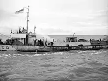 During Operation Infatuate, landing craft and other naval vessels were tasked with drawing enemy fire away from troops landing onshore at a breach in the German defences.[4] The tactic was successful but at great cost to the Allied vessels, the majority of which were either sunk or damaged. During the action, Smith, as he was still known, was sent to the wireless room by his commander while the rest of the officers remained on the bridge.[3] The bridge was then hit by enemy shelling and Smith discovered that all the officers had been killed or wounded.[3] Soon afterwards, the wireless room and the engine room were also hit by enemy fire.[3] Smith took control of the landing craft and manouvered it on one engine next to a hospital ship where the wounded were taken aboard.[3]