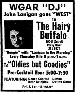 Lanigan's Cleveland debut occurred at WGAR (1220 AM) in December 1971, taking over as that station's morning-drive host after the departure of Don Imus for WNBC (660 AM) in New York City.[5] He was hired by WGAR general manager Jack G. Thayer after attracting his attention at a New Orleans industry convention, and bypassed 65 other applicants for the on-air position.[6] Imus's quickly-earned notoriety in the Cleveland market caused some newspaper critics to viewed Lanigan as "desperately trying to emulate" Imus[7] in addition to trepidation on Lanigan's part.[8] Lanigan in the Morning, however, was an immediate ratings success. By the end of 1972, Lanigan was battling WIXY's Mike Reineri, WJW's Ed Fisher and WERE shock jock Gary Dee for the top-rated spot in morning drive[9] a ranking Imus also attained in his first year at WGAR.[10] While Lanigan's persona was nearly as controversial as Imus, he specialized more in satire and ribaldry he referred to as "adult humor"[11] and the station described as "radio for consenting adults".[12]