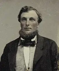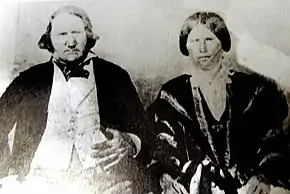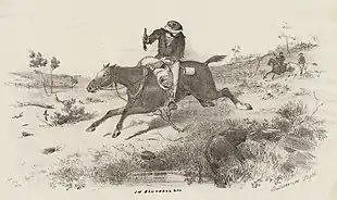 Mid-morning on Tuesday, 16 July 1861, Sergeant John Middleton and Constable William Hosie, who were stationed at Tuena, arrived at William Fogg’s hut near Bigga in the upper Lachlan River district, having received intelligence that Fogg was harbouring one or more bushrangers.[40] As they approached the hut Mrs. Fogg appeared and, seeing the policemen, “threw up her arms in alarm”. Middleton entered the hut, where Frank Gardiner was hiding in an inner room behind a calico screen. As the sergeant approached the screen Gardiner warned “I’ll blow out the brains of the first man that comes in here”. Disregarding the warning Middleton lifted the cloth and the two men fired at each other at close range.[41] Middleton, with a single-shot pistol, reloaded but his pistol then mis-fired. Gardiner, with a five- or six-shot revolver, repeatedly fired at the policeman who received a bullet in the mouth, another that went through his left hand and lodged in his thigh and yet another hit the inside of his left knee.[42] He staggered outside and ordered Constable Hosie to look for a way to enter the house at the rear. This was not possible so Hosie then entered the hut and fired at Gardiner, “cutting him across the mouth”; the bushranger returned fire, the bullet flattened against Hosie’s temple, which felled him.[43] Gardiner, now out of ammunition, then attacked Middleton with the butt-end of his gun. Suddenly, to Middleton’s “utter astonishment and joy”, Hosie recovered from being stunned by the bullet and seized Gardiner from behind. After a desperate struggle, during which Middleton joined in by repeatedly striking Gardiner’s head with the end of his whip, Hosie managed to take possession of Gardiner’s revolver and the bushranger was handcuffed. During the fight Fogg had repeatedly intervened, staying Middleton’s hand and imploring him “not to kill the man”. With Gardiner restrained Middleton demanded a horse from Fogg to transport the prisoner to Bigga, but Fogg either refused or "said there were none", so the sergeant proceeded to Bigga alone to seek assistance, leaving Hosie to guard the prisoner. Weak and faint from loss of blood, and in severe pain, Middleton lost himself in the bush and took nearly four hours to reach Bigga.[44][41][45][46]