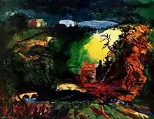 Piper continued to write extensively on modern art in books and articles.[38][39][40] From 1946 until 1954, Piper served as a trustee of the Tate Gallery.[1] Throughout the 1960s and 1970s he frequently visited Pembrokeshire to paint.[41] He was a theatre set designer, including for the Kenton Theatre in Henley-on-Thames. He designed many of the premiere productions of Benjamin Britten's operas at Glyndebourne Festival Opera, the Royal Opera House, La Fenice and the Aldeburgh Festival, as well as for some of the operas of Alun Hoddinott.[12] Piper also designed firework displays, most notably for the Silver Jubilee of Elizabeth II in 1977.[42]