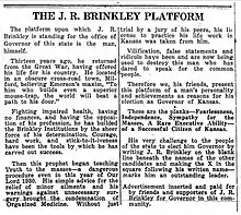 - ↑ '"The J. R. Brinkley Platform" (advertisement), Belleville (Kansas) Telescope, October 30, 1930, page 18.