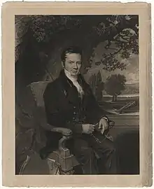 In 1834, a mezzotint portrait of Ralston was published by Agnew & Zanetti; the composite image was formed of a portrait by American painter George Freeman (misspelled as "Frieman"/"Frierman" in some advertisements) of Ralston sitting in a chair under a tree, with a copy of one of Ralston's own pastoral landscapes as the background.[49][50][51] It was included in the collected volume of Views of the Ancient Buildings in Manchester which was published after his death.[20] A copy is held by the National Portrait Gallery.[52]