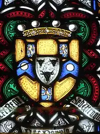 Stained glass armorial, Lord Rolle memorial window, north transept, Bicton Church, built 1850 by Louisa Trefusis. The arms are Rolle with an inescutcheon of pretence of Walrond: Argent, three bull's heads affronte sable. This marshalling indicates that Judith Walrond was an heraldic heiress, the sole heiress of her father, and that the Walrond lands had descended to Rolle