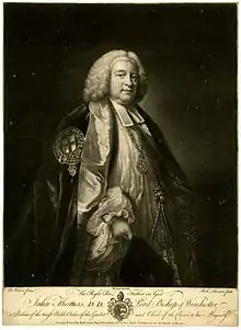Thomas died at Winchester Palace, on 1 May 1781, and was buried in Winchester Cathedral. There are portraits of the bishop at the palaces of Salisbury and Lambeth, and a fine mezzotint engraving (three-quarter length in robes of the Garter) by R. Sayer from a picture by Benjamin Wilson, published on 24 January 1771.[1]