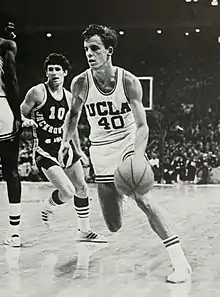 After transferring to UCLA in 1968, he became an integral member of the Bruins' backcourt in 1968. Vallely was quick to make the transition from forward to guard at UCLA. In his first season, he was the Bruins' third leading scorer (12.9 ppg) and adapted smoothly to head coach John Wooden's "attack and gamble offense".[1] He was a member of the UCLA teams that won national titles in the 1969 NCAA tournament and the 1970 NCAA tournament. Vallely majored in economics at UCLA and had a 3.36 grade point average as a junior.[1]