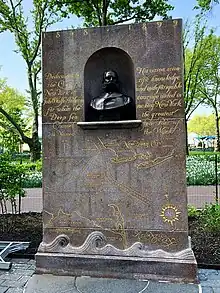 On June 3, 1936, a memorial bust monument of Ambrose was erected in his honor and originally unveiled at Battery Park by his daughter, Katharine Wolfe Ambrose Shrady, and Mayor Fiorello La Guardia. Mayor La Guardia referred to Ambrose "as the pioneer of an idea. Mr. Ambrose was a man ahead of his time. He had vision and persistence to...continually press...his idea" (New York Times, June 4, 1936). Sadly, in November 1990, the bust was stolen and never recovered. However, in late 2017, the City Parks Department finally recreated a new bust and restored the monument, perhaps even surpassing its original beauty. On May 15, 2018—on the anniversary of Ambrose's death—the City held an official statue unveiling and rededication ceremony, which was attended by about 100 people, half of whom were descendants of Ambrose, traveling from eleven different states and Ireland. The newly-restored monument has been relocated from its original location of behind the old Aquarium to the edge of State Street, between Pearl and Water Streets, at The Battery.