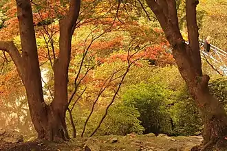 The park contains a Japanese garden centred upon a pond and arched bridge. This section contains bamboos and a wide selection of acers. The paths are lined with rhododendrons and tall beech trees.