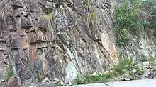 Columnar jointing is a distinctive type of joints that join together at triple junctions either at or about 120° angles. These joints split a rock body into long, prisms or columns. Typically, such columns are hexagonal, although 3-, 4-, 5- and 7-sided columns are relatively common. The diameter of these prismatic columns range from a few centimeters to several metres. They are often oriented perpendicular to either the upper surface and base of lava flows and the contact of the tabular igneous bodies with the surrounding rock. This type of jointing is typical of thick lava flows and shallow dikes and sills.[5] Columnar jointing is also known as either columnar structure, prismatic joints, or prismatic jointing.[6] Rare cases of columnar jointing have also been reported from sedimentary strata.[7]