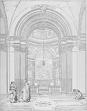 John Shearman assumed that the statue of Jonah was planned for the niche to the right of the altar because this place offered the best angle to view the composition.[1] The statue was carved by Lorenzetto, Raphael's pupil, with assistance of the master, and he almost finished the work by 1520 when Agostino Chigi and Raphael died. Lorenzetto worked on this commission "with all the zeal, diligence, and labor in his power, in order to come out of it with credit and to give satisfaction to Raphael", as Vasari put it. Even so, the statue and its counterpart, the statue of Elijah remained in Lorenzetto's workshop. Vasari records in his Lives, speaking about the statues: