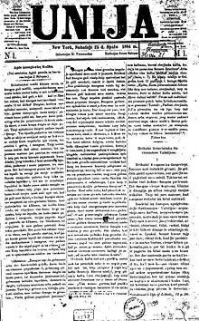 Šliūpas arrived to New York City on 16 June 1884.[46] He did not speak English and tried assorted jobs for a few months until he established contacts with Lithuanian Americans.[47] He met Mykolas Tvarauskas who owned a small printing shop and was the publisher of the first Lithuanian American newspaper Gazieta lietuviška in 1879–1880.[48] Together they established the Lithuanian-language weekly newspaper Unija (Union). Initially, the idea was to publish the newspaper both in Polish and Lithuanian, but they could not get enough Polish subscribers due to Šliūpas' focus on the Lithuanian National Revival.[49] The first issue was published on 25 October 1884. It was a small four-page publication that mainly printed Šliūpas' texts that focused on Lithuania's revival, promoted a union with Latvia, discussed children's education, advanced freethinking and socialist ideas. It also published the first poems by Šliūpas' fiancé who stayed behind in Mitau.[50] At the end of 1884, the newspaper had just 250 subscribers.[51] Šliūpas lived together with Tvarauskas in the same room as the printing press – the conditions were very poor and cramped.[52] At the same time, Šliūpas joined the Mutual Aid Society of Saint Casimir at the Polish St. Stanislaus Bishop and Martyr Church and started working on organizing a separate Lithuanian parish to combat Polonization via churches.[53] In April 1885, a Polish committee invited Lithuanians to participate in a parade and fundraising celebrating the Constitution of 3 May 1791. Šliūpas responded in Unija calling Lithuanians to reject the invitation as it was a Polish, not a Lithuanian celebration.[54] This elicited protests from Polish groups as well as from within the Mutual Aid Society of Saint Casimir and, on 27 April, Tvarauskas fired Šliūpas leaving him with no money or a place to stay.[55]