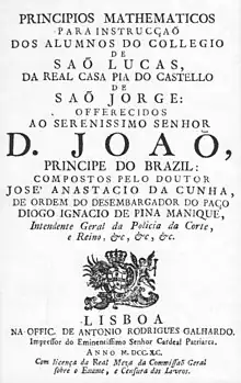 José Anastácio da Cunha (1744 – January 1, 1787) was a Portuguese mathematician. He is best known for his work on the theory of equations, algebraic analysis, plain and spherical trigonometry, analytical geometry, and differential calculus.