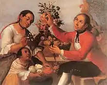 V. The Spaniard and Mulatto woman pass on their respective character and ways to the Morisca girl. [Español, y Mulata, ser, y doctrina dan conforme a su genio a la Morisca].