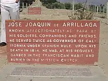 On July 25th, 1813, José Joaquín de Arrillaga died at Mission Nuestra Señora de la Soledad and was buried there.[8] He is said to have been the only Spanish governor to be buried in California and on US soil,[8] but this must be a mistake, because the Spanish Governor before him, José Antonio Roméu, was buried at Carmel Mission in 1792. José Joaquín de Arrillaga's grave is at 36°24′17″N 121°21′19″W / 36.40472°N 121.35528°W / 36.40472; -121.35528.[9] The sign there has the inscription: "Known affectionately as "Papa" by his soldiers, companions and friends, he served twice as governor of California under Spanish rule. Upon his death in 1814 he was, at his request, garbed in the Franciscan habit and buried in the mission church." He was called "papa," because he worked hard to improve the lives of his men.