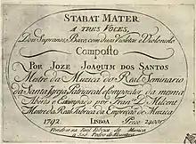 According to musicologist Robert Stevenson, Santos' own composition style was strongly influenced by Neapolitan opera composer Davide Perez who taught him at the seminary,[8] and commenting about Santos' overall approach, Enrico Ruggieri says in his thesis, "He was renowned as master of the stile antico, however he composed music in concertato style as well."[9] Looking specifically at Santos' 1792 setting of the Stabat Mater, Ruggieri noted that "the composition is built around the formal structure of a cantata sacra da camera that belongs to the style of the Neapolitan tradition of composers such as Alessandro Scarlatti or Giovanni Battista Pergolesi."[10] What has been described by musicologist Ricardo Bernardes as "the well-known process of Italianization of musical practices begun in the reign of King João V" is clearly demonstrated here.[11]