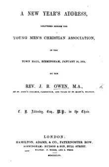 The Reverend Joseph Butterworth Owen (22 July 1809 - 24 May 1872) was an English clergyman, social reformer and author of the nineteenth century. Known primarily for his published work, he is also notable for being the last minister of the famed Evangelical Chapel St John's Chapel, Bedford Row as well as chancellor of The Royal Polytechnic Institution.[1] Owen's published sermons and biography provided the target for Samuel Butler's satirical novel The Fair Haven.