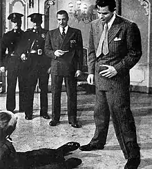 Calleia had his first real role as a villain in Small Miracle, and his success in the play was responsible for his move to Hollywood.[25] Calleia's contract with Metro-Goldwyn-Mayer permitted him a hiatus of six months a year, to continue his stage work.[26] He was not new to motion pictures—he had made three feature films on the East Coast[27]—but when MGM put Calleia under contract, they promoted his first film, Public Hero No. 1 (1935), as his screen debut.[28] Calleia's portrayal of the gunman was listed by film critic Andre Sennwald of The New York Times as one of the year's 10 best male performances.[29][30]