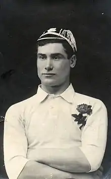 Joseph Davidson[1] or ‘Joe’ as he was more affectionately known was born at Aspatria, Cumberland, on 5 October 1878. Although basically a forward he could play in any position. A regular Aspatria RUFC first team player from an early age, he gained a County cap before his nineteenth birthday. He gained two England international caps, against Wales and Scotland in the 1899 Home Nations Championship.[1][2] In the Calcutta Cup game he had the distinction of being the youngest player on the field, while his brother James Davidson was the eldest. He played three times for the North and forty-three times for the County. Joe was member of the Cumberland Cup winning side in 1899 and again ten years later. Joe was an outstanding sportsman who also excelled at cricket, boxing and athletics. He met an untimely death on 8 October 1910, when along with his brother George was buried alive in the family sand quarry. George was rescued and continued to play for the Aspatria club winning two County Cup winners medals and four County caps.[3]