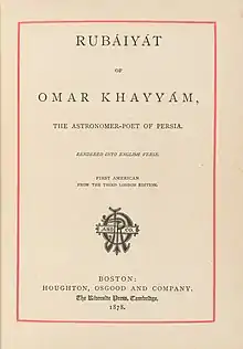 Beginning in 1859, FitzGerald authorized four editions (1859, 1868, 1872 and 1879) and there was a fifth posthumous edition (1889) of his translation of the Rubáiyát of Omar Khayyám (Persian: رباعیات عمر خیام). Three (the first, second, and fifth) differ significantly; the second and third are almost identical, as are the fourth and fifth. The first and fifth are reprinted almost equally often,[20][21] and equally often anthologized.[22]