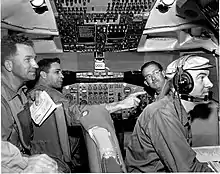Members of the joint FAA and Boeing team performing test flight on the Boeing 707 during certification process on April 15, 1958. From left to right: Joseph John "Tym" Tymczyszyn (FAA), Lew Wallich (Boeing), unknown, unknown.