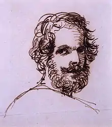 Severn nursed Keats until his death on 23 February 1821, three months after they had arrived in Rome. As he reported to John Taylor two weeks afterwards, "Each day he would look up in the doctors face to discover how long he should live -- he would say -- "how long will this posthumous life of mine last"—that look was more than we could ever bear—the extreme brightness of his eyes—with his poor pallid face—were not earthly --"[6] Severn's ordeal was recognized by Keats himself, who, a month before his death, said, "Severn I can see under your quiet look -- immense twisting and contending -- you dont know what you are reading -- you are induring [sic] for me more than I'd have you -- O! that my last hour was come --"[7] He was later thanked for his devotion by the poet Percy B. Shelley in the preface to his elegy, Adonais, which was written for Keats in 1821. It was also at this time that Severn met, among other notables, the sculptors John Gibson and Antonio Canova, and Lord Byron's friend, the adventurer Edward John Trelawny. Severn made a sketch of Trelawny in 1838.