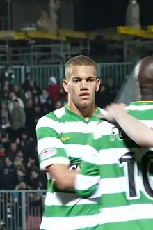 Thompson signed for Celtic on 8 August 2009 for a £250,000 fee,[8] teaming up with Celtic Tony Mowbray who had taken Thompson on trial while he was manager of West Brom. Thompson signed alongside fellow former Stockport youth team players Curtis Jones and Michael Ordish.[9] He made his debut coming on as a substitute for Stephen McManus at Celtic Park in a 1–1 draw with Falkirk on 16 January 2010.[10] He made his first Celtic start in a 4–1 away victory against St Johnstone on 20 March 2010[11] and scored his first goal for the club in a 3–0 victory over St Johnstone on 20 March 2010.[12] Following the match and his first professional goal, Thompson said he wasn't expecting to score for the club so soon after joining.[13] He followed his debut goal up with two in a 2–1 victory for Celtic against Motherwell on 13 April 2010.[14] Despite limited first-team opportunities at Celtic, Thompson was named as the club's Young Player of the Year in his first season. Upon receiving the award, Thompson said that since joining Celtic, he had changed his attitude both on and off the pitch.[15] He made 21 appearances in all competitions for Celtic during the 2009–10 season,[16] and played his final game of the campaign in a 2–1 away victory over Hearts on 9 May 2010. This was to be his final game for the club.[17]