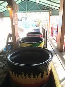 - Circular "Tubs" wind their way through mountainous scenery spinning and changing direction unexpectedly throughout the duration of the ride before returning to the station. Designed by Horace Cole.