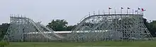 The roller coaster was extensively damaged by a windstorm on the morning of April 3, 2015, including the destruction of large portions of elevated track.[11][12] In April, the owner's son Roger Nelson, told reporters, "We are in the process of tearing it all down", referring to the roller coaster and the remaining buildings on the site. He had announced the previous week that the Preservation Alliance had purchased several of the park's marquee attractions, including the Whacky Shack building and a horse and buggy ride, and was negotiating to purchase the full-size train caboose that was stationed at the west end of Frontier Town.[13] On July 23, 2015, the components of the roller coaster which remained standing were demolished.[14]