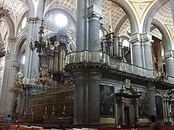 Padilla moved to Puebla, Mexico, between 1620 and 1622.[2] At the time New Spain was a viceroyalty of Spain that included modern day Mexico, Guatemala, the Philippines and other parts of Central America and the Caribbean. Padilla is one of the more important composers represented in the manuscripts at Puebla, Mexico and the Hackenberry collection in Chicago, Illinois. He worked at Puebla de Los Angeles, Mexico, which in the 17th century was a bigger religious center than Mexico City itself. Padilla was hired as a cantor and assistant professor at Puebla Cathedral under the maestro de capilla Gaspar Fernandes.[3] After Fernandes' death, he was appointed maestro of the cathedral in 1629.[4] By 1645, Padilla was overseeing 14 choir boys and 28 cantors. Some of the musicians under Padilla would themselves go on to become important figures in the music of New Spain, such as Francisco López Capillas.[3] The Mexican composer Juan García de Zéspedes was a boy soprano in the cathedral choir under Padilla, and later succeeded him to the office of maestro in 1664.[2]