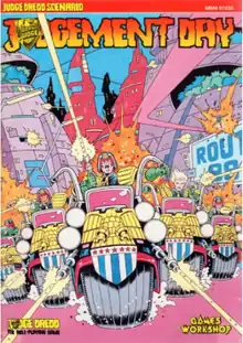 Games Workshop (GW) first published Judge Dredd: The Role-Playing Game in 1985. The following year, GW released the game's first adventure, Judgement Day.[2] The 32-page book was written by Marcus L. Rowland, with a cover by Brett Ewins. It also included 16 pages of player aids and cardstock miniatures of non-player characters.[3]