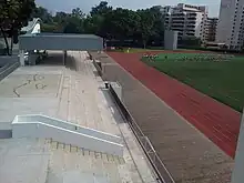 The college has sport facilities such as a stadium holding a synthetic football field and a 400-metre 8-lane track with provision for field events and steeplechase. The stadium has a seating capacity of 1500. Sports and games facilities include four badminton courts in the college hall, table tennis facilities, two tennis courts, four multi-purpose courts for basketball, volleyball and netball, two squash courts as well as a semi-underground rifle range with ten targets. Apart from a gymnasium, there is an outdoor rock climbing wall and Physical Fitness Circuit with 12 stations. To add on, the rooftop of the PD block is equipped with zip-line (or often termed "flying fox") and abseiling facilities.