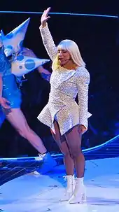 "Just Dance" was included on her third concert tour, the Born This Way Ball (2012–2013), where Gaga performed it on the extended stage walkway and shouted off to her fans for joining and dancing onstage. Emily Zemler from The Hollywood Reporter noted that "For all her preconceived speeches, these genuine moments resonated deeply with the audience, most of whom were dressed in tribute to the singer."[80] In 2014, Gaga performed the song during her residency show at Roseland Ballroom, while wearing a yellow outfit.[81] For her worldwide tour, ArtRave: The Artpop Ball, Gaga combined "Just Dance" with short performances of "Poker Face" and "Telephone". While she danced and sang the songs, the backdrops displayed multiple images of Gaga writhing around, while wrapped in tinsel and moss.[82] During "Just Dance", she strapped on a seahorse-shaped keytar.[83] Melissa Ruggieri from The Atlanta Journal-Constitution was impressed with Gaga's vocals and complimented her for performing "old songs" in her actual voice.[84]