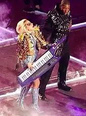 On February 5, 2017, Gaga performed "Just Dance" during the Super Bowl LI halftime show.[85] She was wearing a spicy gold jacket and played on a keytar, while one of her dancers held the microphone for her.[86][87] In the same year, the song was added to the setlist of Gaga's two shows at the Coachella Festival, where she was one of the headliners.[88] On the Joanne World Tour (2017–2018), Gaga wore a pearl-encrusted pale blue bodysuit with dramatic shoulder pads, and knee-high lace up boots while performing the track.[89][90] "Just Dance" served as the opening song of the singer's Las Vegas residency, Enigma (2018–2020). During the performance, Gaga descends from the ceiling in a harness and a sequined jumpsuit while playing on a keytar.[91] In 2022, the singer performed "Just Dance" at The Chromatica Ball stadium tour.[92]