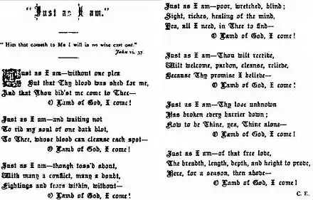 "Just as I Am" is a well-known hymn, written by Charlotte Elliott in 1835, first appearing in the Christian Remembrancer, of which Elliott became the editor in 1836. The final verse is taken from Elliott's Hours of Sorrow Cheered and Comforted (1836).[1]