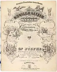 The Königgrätz March (AM II, 134 (AM II, 195)), also known as Der Königgrätzer or Der Königgrätzer Marsch, is one of the most famous German military marches, composed in 1866 by Johann Gottfried Piefke in commemoration of the Battle of Königgrätz, the decisive battle of the Austro-Prussian War, in which the Kingdom of Prussia defeated the Austrian Empire. In Piefke's most successful arrangement of the Königgrätzer Marsch, another march, Der Hohenfriedberger (commemorating the Battle of Hohenfriedberg), is used as a trio. The commonly played version (AM II, 195) is set as an infantry march, while an alternate adaptation is arranged as a cavalry galop (AM III, 228). The German military march catalogue also has the "Königgrätzer mit anderem Trio" ("Königgrätzer with Other Trio"; Heeresmarsch IIIB, 67), but this secondary composition is far less recognized.