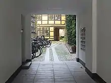 The building fronting the street is four storeys tall and six bays wide. The plastered facade is finished with shadow koints on the ground floor, a cornice band between the second and third floor and a cornice below the roof. The first and second floor windows are topped by plastered hood moulds. The slate-clad roof features four dormer windows towards the street and three dormer windows towards the yard. An arched gateway in the left-hand side of the ground floor affords access to the courtyard as well as to the three upper floors of the front wing.[23]