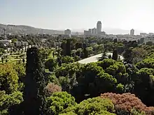 The debris in the 360,000 m2 (3,900,000 sq ft)-area, which was ruined by the great fire of Smyrna, started to be cleaned in the second half of 1934 and the foundation of Kültürpark was laid on January 1, 1936.[5][6] Before the fire, there was an Armenian quarter in this area.[7] Kültürpark was opened to the public on September 1, 1936 with the 6th İzmir International Fair, inaugurated by Prime Minister İsmet İnönü.[5][6] In 1937, İzmir Parachute Tower was built in the park.[6] In 1938, İzmir Zoo and Vakıflar Pavilion and Clock Tower were opened.[6] In 1939, the park was expanded for 60,000 m2 (650,000 sq ft) southwards and has reached 420,000 m2 (4,500,000 sq ft) in size.[6][8] In 1951, the İzmir Archaeological Museum moved into the park where it was active until 1984.[6] In September 1952, the İzmir Art and Sculpture Museum was opened in the park and moved to its new building, which was built outside the park in 1973.[9] In 2004, İzmir Museum of History and Art was established inside the park.[10] With the opening of İzmir Wildlife Park in 2008, the zoo in the park was closed and the animals were moved to the new area.[6][11] In August 2009, an underground car park with 594 vehicle capacity was put into service.[12] In June 2015, free Wi-Fi was made available in the park.[13] All the fairs in the city were organized in Kültürpark before Fuar İzmir was built in 2015 in Gaziemir. Today only İzmir International Fair and İzmir Book Fair are held in the park.[14] In 2017, the Kültürpark Cup tennis tournament was held for the first time.[15]