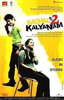 Kadhal 2 Kalyanam (transl. Love to Marriage) is an unreleased Tamil-language romantic comedy film directed by newcomer Milind Rau that stars debutante Sathya, brother of Tamil actor Arya, and Divya Spandana, whilst, Jayashree, Nagendra Prasad, Kasthuri and Anuja Iyer play pivotal roles.[1] Noted film critic Baradwaj Rangan had written the dialogues, while Yuvan Shankar Raja composed the film's score and soundtrack. The cinematography and editing were handled by P. S. Vinod and Leo John Paul, respectively. Pre-production works began by mid-2008, while the filming continued for over one year, being completed by July 2010. The film was jointly produced by Mirchi Movies and East Coast Entertainment, who are now not in the film-making business.[2] Hence the movie remains unreleased.