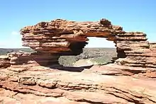 Kalbarri National Park preserves the inland desert regions of red and white striped Tumblagooda sandstone east of the town of Kalbarri, particularly the lower reaches of the Murchison River and its gorge, as well as the mouth of the river by Meanarra Hill.[4]