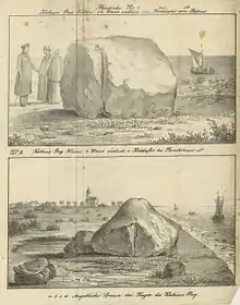 In Estonian (mainly East Estonian) legends, Kalevipoeg carries stones or throws them at enemies, and also uses planks edgewise as weapons, following the advice of a hedgehog.[3] He also forms surface structures on landscape and bodies of water and builds towns. He walks through deep water. Kalevipoeg eventually dies after his feet are cut off by his own sword owing to his own priorand fatally ambiguousinstructions.