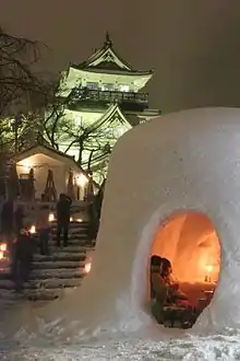 Winter events with kamakura snow huts are currently held in a number of locations in Japan. For example, in Yokote City in central Akita prefecture such events are celebrated every February 14 to 16. This event likely dates to a time when the Onodera clan ruled that area during the Sengoku period.[3] During Yokote's Kamakura Festival, several hundred snow domes of various sizes dot the city. This event is immediately followed by a Bonden Festival during which Shinto ceremonies occur. Together, both festivals are sometimes jointly described as the "Yokote Snow Festival".[4] In Yokote City there is also a small museum about the history of kamakura snow domes.[5]