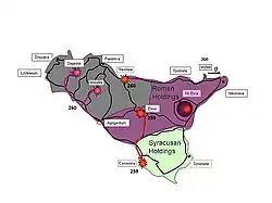 In 259 BC in the First Punic War, the Carthaginians under Hamilcar seized Kamarina. In 258 BC it fell into the hands of the Romans[1] after a lengthy siege at the Battle of Kamarina.[12]