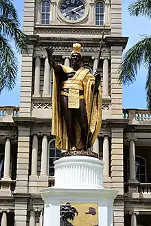 The statue is an oversized brass cast of King Kamehameha I, the ruler credited with unifying the Hawaiian Islands in the early nineteenth century and establishing the Kingdom of Hawaiʻi in 1810. The surface is two-toned, finished with a dark brown chemical patina with gilded (See gilding) garments. Erected in 1883, it was commissioned as a replacement for Kamehameha the Great (original cast), which had been commissioned to celebrate the centennial of Captain James Cook’s arrival to the Hawaiian Islands. It was placed in front of the Aliʻiōlani Hale government building in Honolulu, the spot intended for the original cast, and remains there to this day.