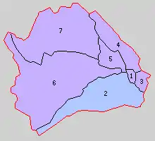 1. Nakaniida; 2. Shikama; 3. Naruse; 4. Hirohara; 5. Kamiishi; 6. Onoda; 7. Miyazaki; Purple = Kami Town; Blue= Shikama Town; Pink = Rikuzentakata Town; Blue = Kamaishi City