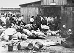 When they arrived at the camp, prisoners had to strip naked, either to be shaved and given camp clothes or to be gassed. From around 1942, the belongings of murdered Jews, Poles, French citizens, the Roma and Soviet citizens and POWs were regarded as the property of Germany, which meant the camp made no attempt to pass it to the next of kin.[6] The goods were sorted and packaged by the Kanada Kommando, appointed from among registered prisoners who had been admitted to the camp as workers. The goods were then used in the camp itself or sent elsewhere, including to Germany.[7]