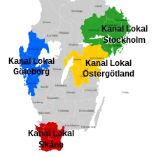 - Kanal Lokal Östergötland, broadcasting to Östergötland via the Motala, Linköping and Norrköping transmitters.