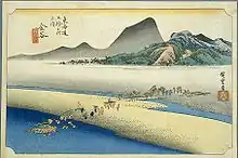 The classic ukiyo-e print by Andō Hiroshige (Hōeido edition) from 1831–1834 depicts a daimyō procession on sankin-kōtai crossing the river. The daimyō is riding in a kago, held above the water by a makeshift platform carried by numerous porters. His retainers are attempting to wade across the river. In the background, a small village is shown in the foothills.